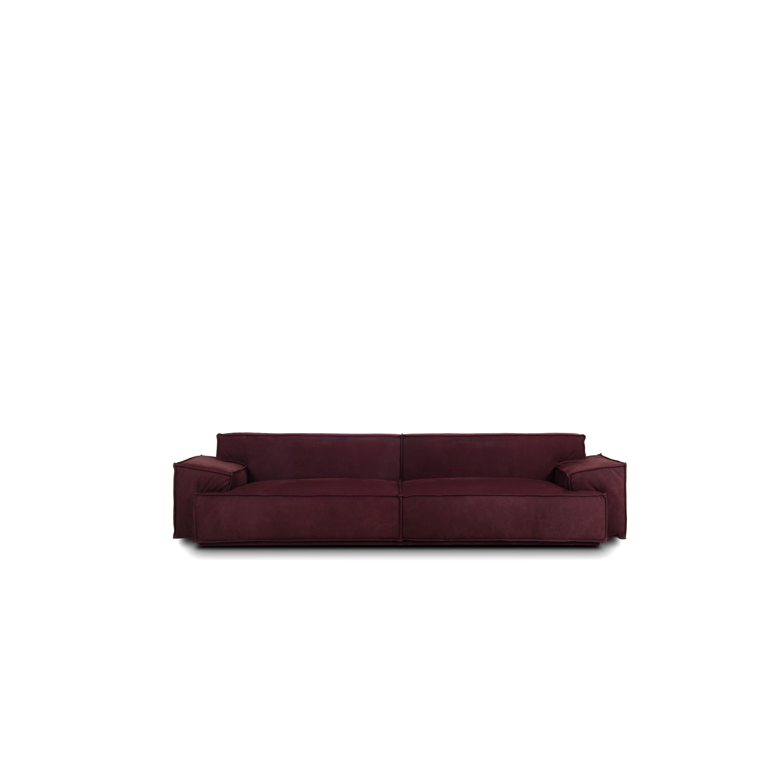 Projekt wyróżnia się mocną, architektoniczną bryłą, która z wyczuciem balansuje pomiędzy wyrazistymi, rzeźbiarskimi podłokietnikami a lekkimi, metalowymi nogami unoszącymi całość nad podłogą. To zestawienie nadaje meblowi wizualnej lekkości, nie odbierając mu monumentalnego charakteru.