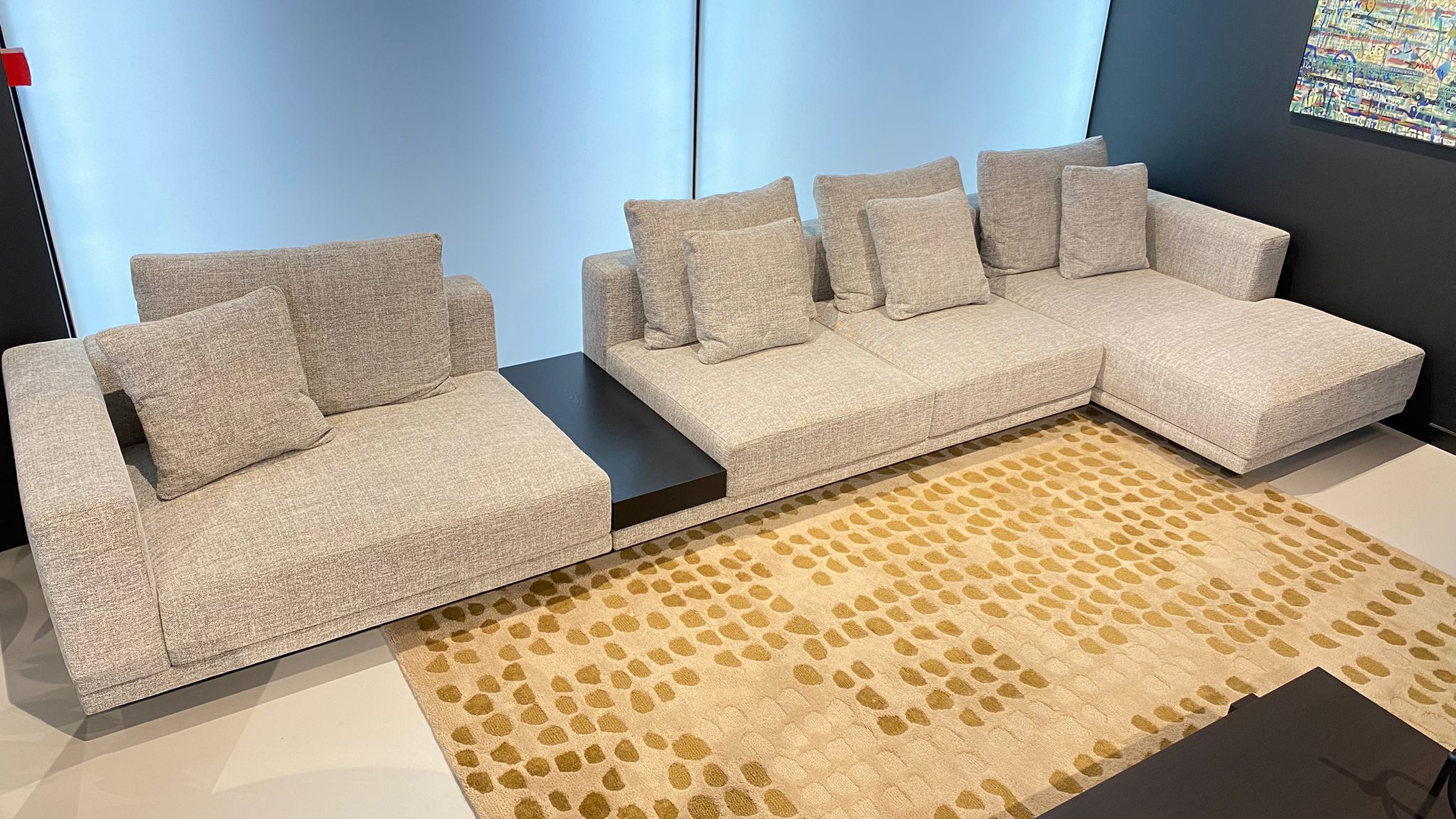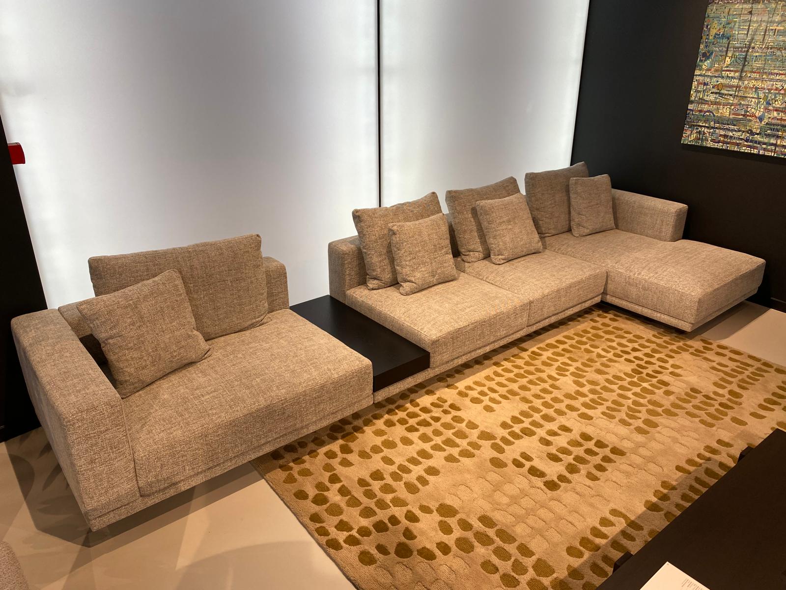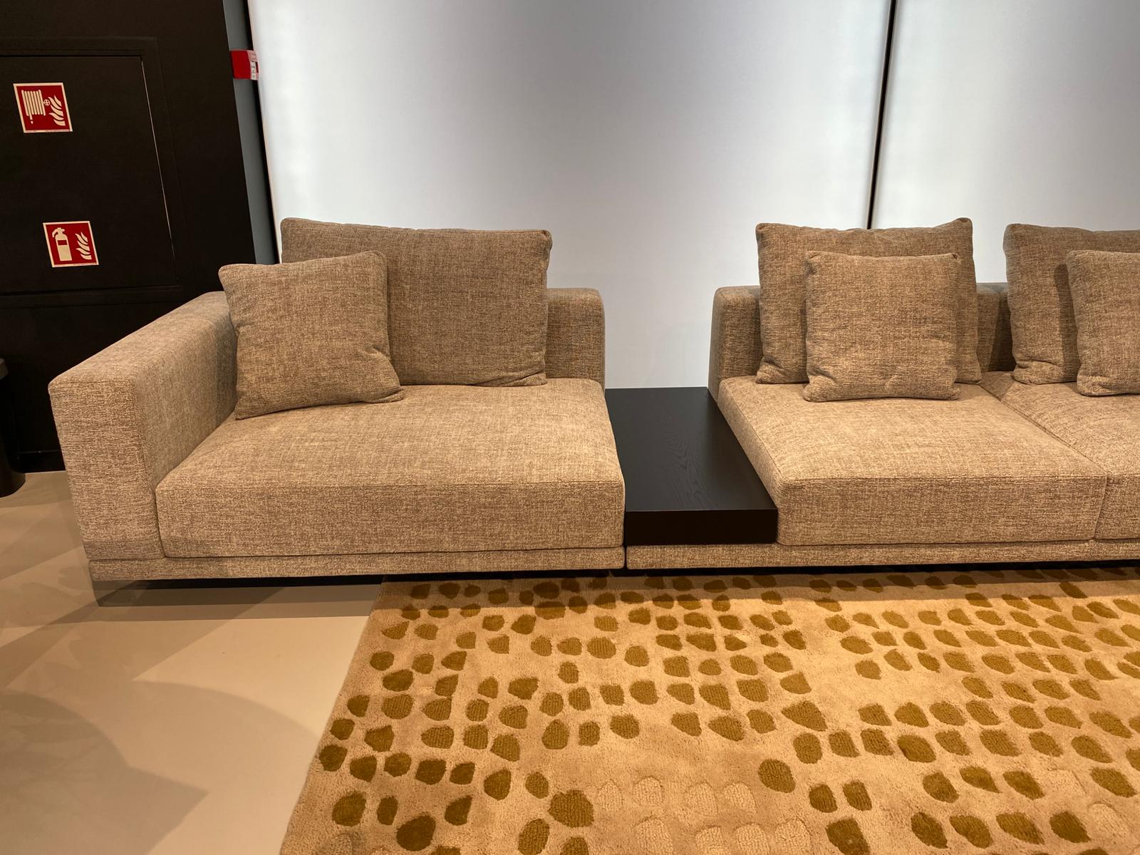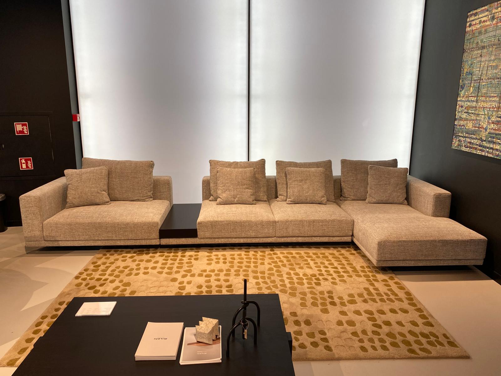 Oferta dotyczy sofy Classic z ekspozycji z salonu w Warszawie. Sofa w rozmiarze: 455 cm x 170 cm, w tkaninie Ileo 11, półka fornir kolor czarny. Poduszki szerokie.